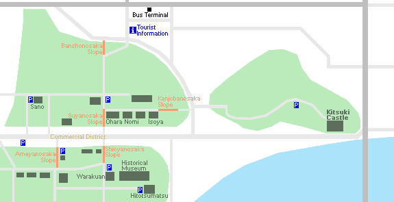 The city of Kitsuki (nz) is located on the southern side of the Kunisaki Peninsula. The city center is sometimes referred to as a "sandwich castle town", because of its interesting topography of having two samurai districts on hills north and south respectively, sandwiching a commercial district in the middle. The districts combined measure about 500 meters north-south and 1.5 kilometers east-west, with Kitsuki Castle standing at the eastern end, close to the coast facing the Seto Inland Sea.