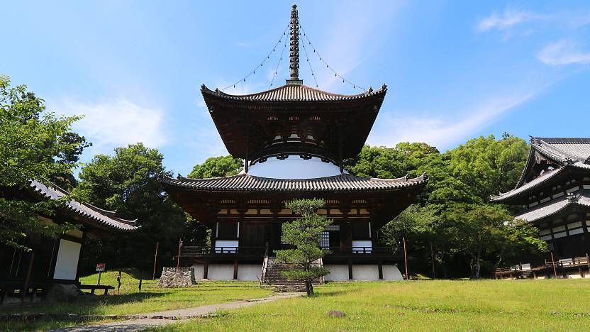 Today, the temple features many attractive buildings spread across spacious grounds. Approaching from the Iwade Toshokan bus stop, one first arrives at the grand main gate, from where it is a few minutes' walk to the main area. Just beyond an elegant two-storied gate sits the Komyoden, a hall dedicated to Dainichi Nyorai, and two smaller pavilions tucked away behind a pond.