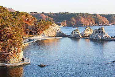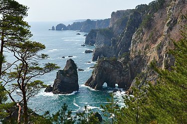 The Sanriku Coast (OC, Sanriku Kaigan) is a dramatic, rocky shoreline with countless bays, cliffs and coves that stretches for over 300 kilometers along the Pacific Coast of the Tohoku Region, spanning Aomori, Iwate and Miyagi prefectures. Due to its natural beauty, the coastline has long been a popular tourist attraction, and a considerable part of it has been designated as national park (Sanriku Recovery National Park).