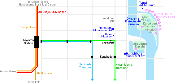 Korakuen is about 1.5 kilometers or a 25-30 minute walk east of Okayama Station. Trams on the Higashiyama Line can be taken to Shiroshita stop (5 minutes, 120 yen one way, frequent departures) from where the garden's south gate can be reached in a 10-15 minute walk.