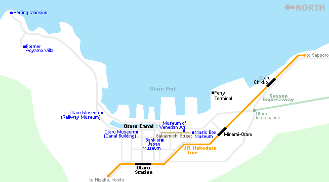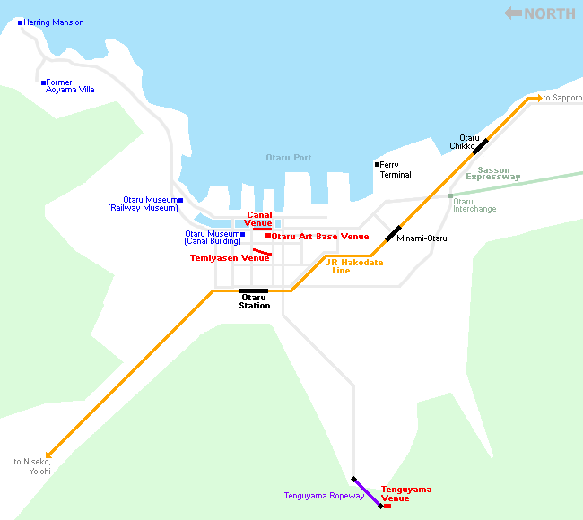 The Canal venue beside Otaru Canal is a ten minute walk straight down the main road from Otaru Station, while the Temiyasen venue lies about half way between the station and the canal, running parallel to the canal. The Tenguyama venue is located around the upper station of the Tenguyama Ropeway (2000 yen round trip), whose lower station can be accessed from Otaru Station in a 20 minute ride by bus number 9 (240 yen one way, every 30 minutes).