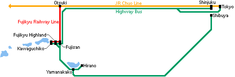 Fujikyu operates approximately one bus every two hours between Shibuya (Mark City), Fuji Q Highland, Kawaguchiko Station and Fujisan Station. The one way journey takes 2 to 2.5 hours and costs 2100 yen. Online reservations can be made through Willer. The Japan Rail Pass is not valid on these buses.