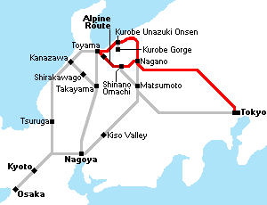 Take the Hokuriku Shinkansen to Toyama, and then instead of completing the entire route, travel only to as far as Murodo, turn around and return to Tokyo the same way you came. The journey is fully covered by the Japan Rail Pass except for the Alpine Route itself. While this itinerary is somewhat less time-consuming than the above one (partial route via Matsumoto), travelers will not be able to experience what many consider the more spectacular section between Murodo and the Kurobe Dam.