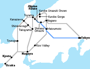 Take the Hokuriku Shinkansen from Tokyo to Toyama and traverse the Alpine Route to Ogizawa. From Ogizawa, take a bus to Nagano and return to Tokyo by the Hokuriku Shinkansen. The entire trip is covered by the Japan Rail Pass except for the Alpine Route itself. This itinerary can also be done in the opposite direction. With an early start, it is possible as a day trip.