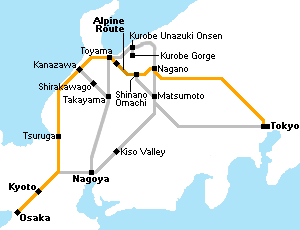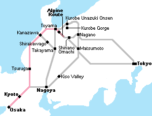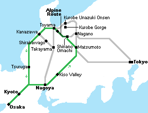 Take a limited express train from Kyoto or Osaka to Tsuruga, transfer to the Hokuriku Shinkansen to Toyama and traverse the Alpine Route as far as the Kurobe Dam before backtracking the same route to Kyoto or Osaka. The entire trip, except the Alpine Route itself, is covered by the Japan Rail Pass. This itinerary cannot be done in a daytrip due to a lack of early-morning connections to Toyama on most days.