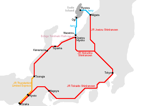 From Niigata, Sado Kisen operates car ferries (departures every 3 hours) and high speed jetfoils (departures every 1-2 hours depending on the season) to Ryotsu on Sado Island. The one way journey by car ferry takes 2.5 hours and costs around 2,900 yen per person and around 19,000 yen for an average sized car. By jetfoil it takes one hour and costs around 7,000 yen. The ferry terminal in Niigata is located next to the Toki Messe complex, a 15 minute bus ride from Niigata Station (260 yen one way). Online reservations are possible via Direct Ferries.