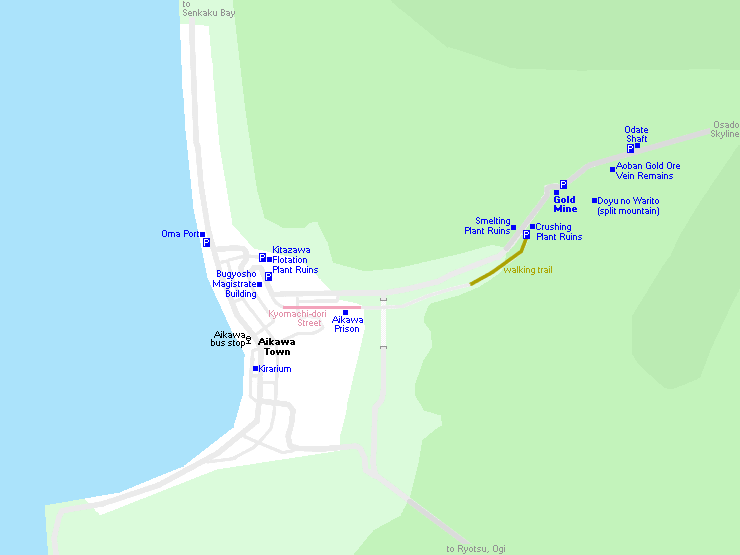 Some buses along the Main Line operate all the way from Ryotsu to the Sado Gold Mine (75 minutes, 860 yen one way, hourly on weekends, but less frequent on weekdays). The other buses go only as far as Aikawa (one hour, 860 yen, 1-2 buses per hour), from where the Gold Mine is a short taxi or additional bus ride (infrequent departures) or a 30-45 minute walk.