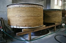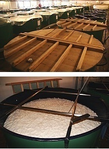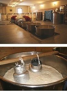 More steamed rice, water from the local well and koji are added to the starter mash to create the main mash (moromi). The main brewing process takes about four weeks, with the koji turning the rice starch into sugar and the yeast fermenting the sugar into alcohol. While Daishichi is using steel tanks for most of its sake production these days, a small amount of rice wine is also produced with a wooden tank.