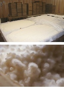 Koji is a mold, which plays an essential role in the production of sake. It is used for the cultivation of sake yeast and for the fermentation of rice starch into sugar. Koji is cultivated by sprinkling koji spores onto steamed rice and letting it grow in hot and humid rooms for about two days. Subtle temperature changes are applied to produce different koji cultures, which again give the sake different flavors.