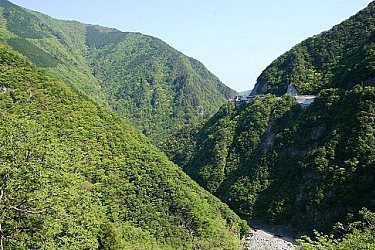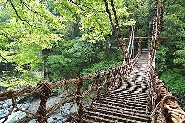 The Iya Valley (cJk, Iyakei) is a remote, mountainous valley in western Tokushima Prefecture. Located in the heart of Shikoku Island, the secluded valley is characterized by steep mountain slopes and deep rocky gorges which were traditionally crossed by vine bridges. Three of the bridges, Iya Kazurabashi and the Oku-Iya Kazurabashi bridges, are maintained to this day and remain some of the most popular attractions of the area. Iya is also known for hot springs and outdoor activities.