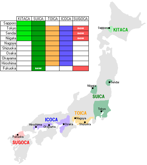 From March 13, 2010, all three prepaid IC cards of the Fukuoka region (JR Kyushu's Sugoca, Nishitetsu's nimoca and the city's Hayakaken) will become mutually compatible. Furthermore, JR East's Suica card will also become valid on all trains, subways and buses in the Fukuoka area, while Sugoca will become valid on JR trains in the Greater Tokyo, Niigata and Sendai areas.
