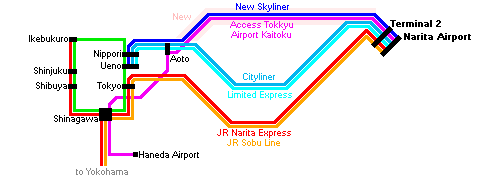 ![]() New Skyliner trains depart every 20-40 minutes, run at up to 160 km/h, and take as littles as 36 minutes to travel from Nippori Station to the airport, compared to 50-60 minutes required previously by the fastest trains. The one way fare for the New Skyliner is 2400 yen, 480 yen more expensive than the old Skyliner, but cheaper than the regular fare of the Narita Express. During daytime, hourly Cityliner trains continue to run along the Skyliner's old route, stopping at Narita, Funabashi and Aoto along the way. The one way trip between the airport and central Tokyo by Cityliner takes about 70 minutes and costs the same as the old Skyliner (1920 yen). Access Tokkyu and Airport Kaitoku trains newly run approximately every 40 minutes from Narita Airport along the new route to Aoto Station and then continue via the Asakusa Subway Line and Keikyu Line all the way to Haneda Airport. The one way trip between the two airports takes around 105 minutes and costs 1740 yen, creating a competitive alternative to the limousine buses. Regular Limited Express trains continue to run approximately every 20 minutes along the old route between the airport and central Tokyo. Travel duration (75 minutes) and fares (1000 yen) remained unchanged. In the mornings and evenings, some Access Tokkyu trains run along the new route between the airport and Ueno at a reduced travel duration but for an additional 200 yen. The Japan Rail Pass is not valid on any of the above mentioned trains. |