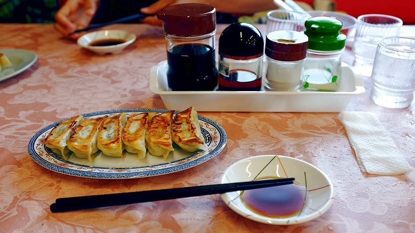 Gyoza are found nationwide at ramen shops, Chinese restaurants, izakaya (casual dining establishments) and a small number of gyoza specialty shops. A typical serving of gyoza consists of about half a dozen dumplings and costs around 300 to 600 yen. Gyoza are usually eaten with a dipping sauce made at the table of equal amounts of soy sauce and vinegar. A bit of chili oil (rayu) is also commonly added.